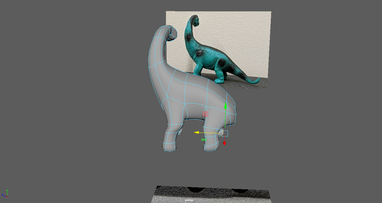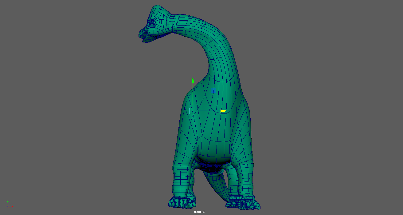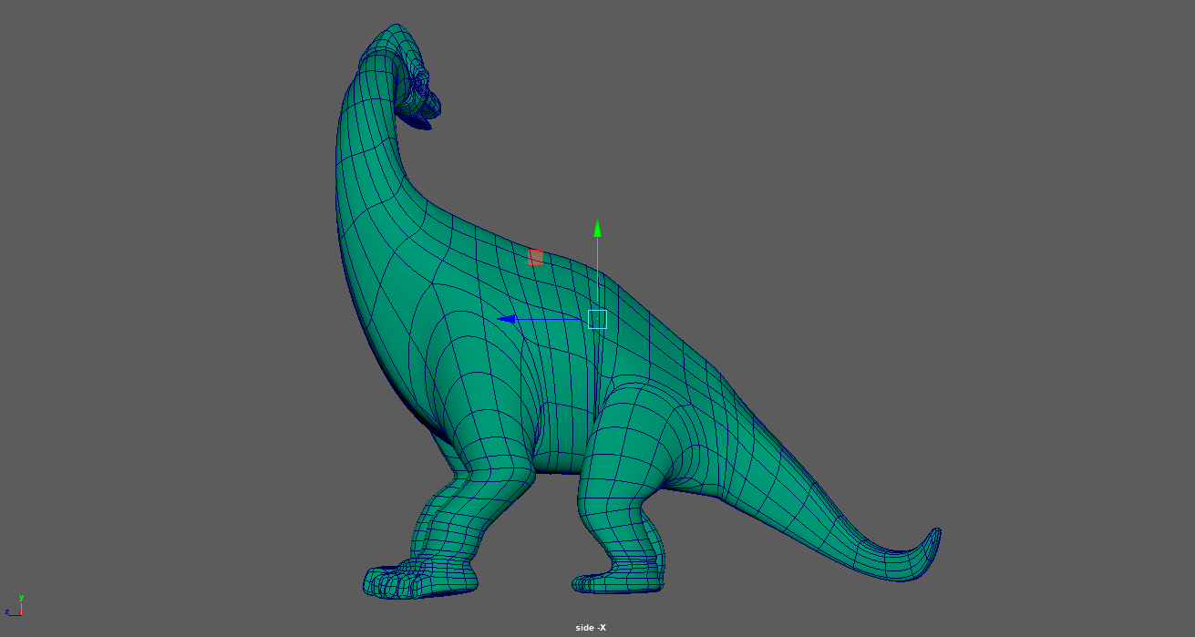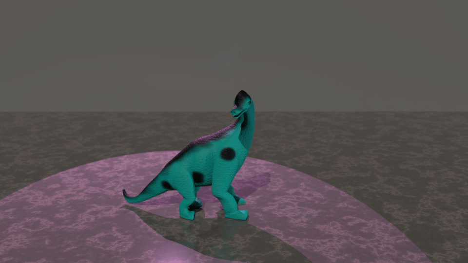 The result: One area I'm not satisfied with is the bump mapping. I was able to achieve a generally bumpy surface, but the original model has intentional folds and creases in areas that seem to make sense for a large, articulated animal. With more time, I think I could play with the UV layout in Photoshop to generate an accurate bump map. Finally, when it came time to render, I gave my floor some interesting texture but left it highly reflective because I found those reflections interesting. I enabled Depth of Field in Arnold and fine-tuned it in order to help sell the small size of the model. Some of the background blur was unsatisfactory so I raised the camera sampling numbers until I found a medium ground between quality and render time. I would have likely added motion blur in as well since the camera orbits quickly, but this increased render time greatly and conflicted with the goal of showing the model clearly. |