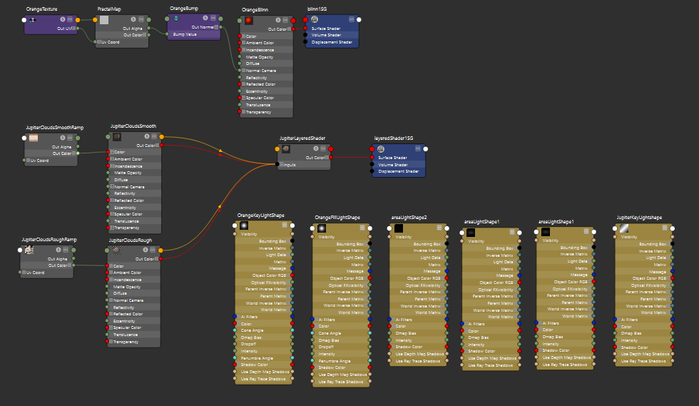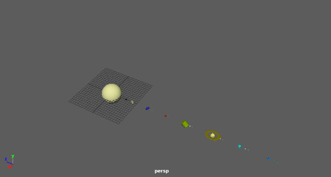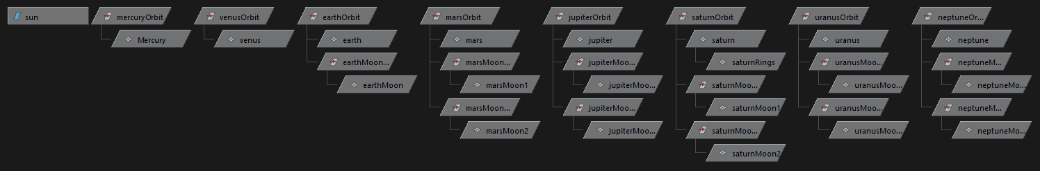 ![]() .AVI link Here are our eight planets and a few moons orbiting a sun. There are a variety of primitives rotating around their own axes as well as revolving around the Sun. In order to make more obvious the y-rotation of some objects (such as a cylinder), the objects have been rotated along their x- or z-axis. When parenting moons directly to these rotated objects, the moons would inherit this axial rotation, causing them to revolve outside the original plane. Since the assignment did not specify whether or not all objects should remain in the same plane, I suppose it may have been fine to leave them this way. However, I thought it would be an interesting exercise to see if I could figure out how to get them back. The simplest solution seems to be parenting the moon to a planet's rotation group (as seen in the hypergraph below) instead of to the parent itself. This does however remove the addition planet's rotation y-axis rotation from the movement of the moon. If this motion were necessary to incorporate, I think I would try adding another group for the planet's y-axis rotation that both the planet and moon are parented to. The x- or y-axis rotation could then be applied directly to the planet without affecting the moon. |
