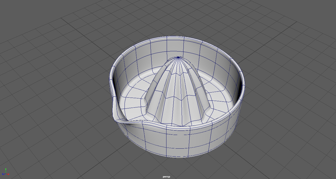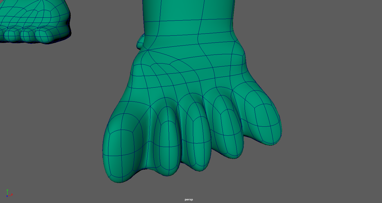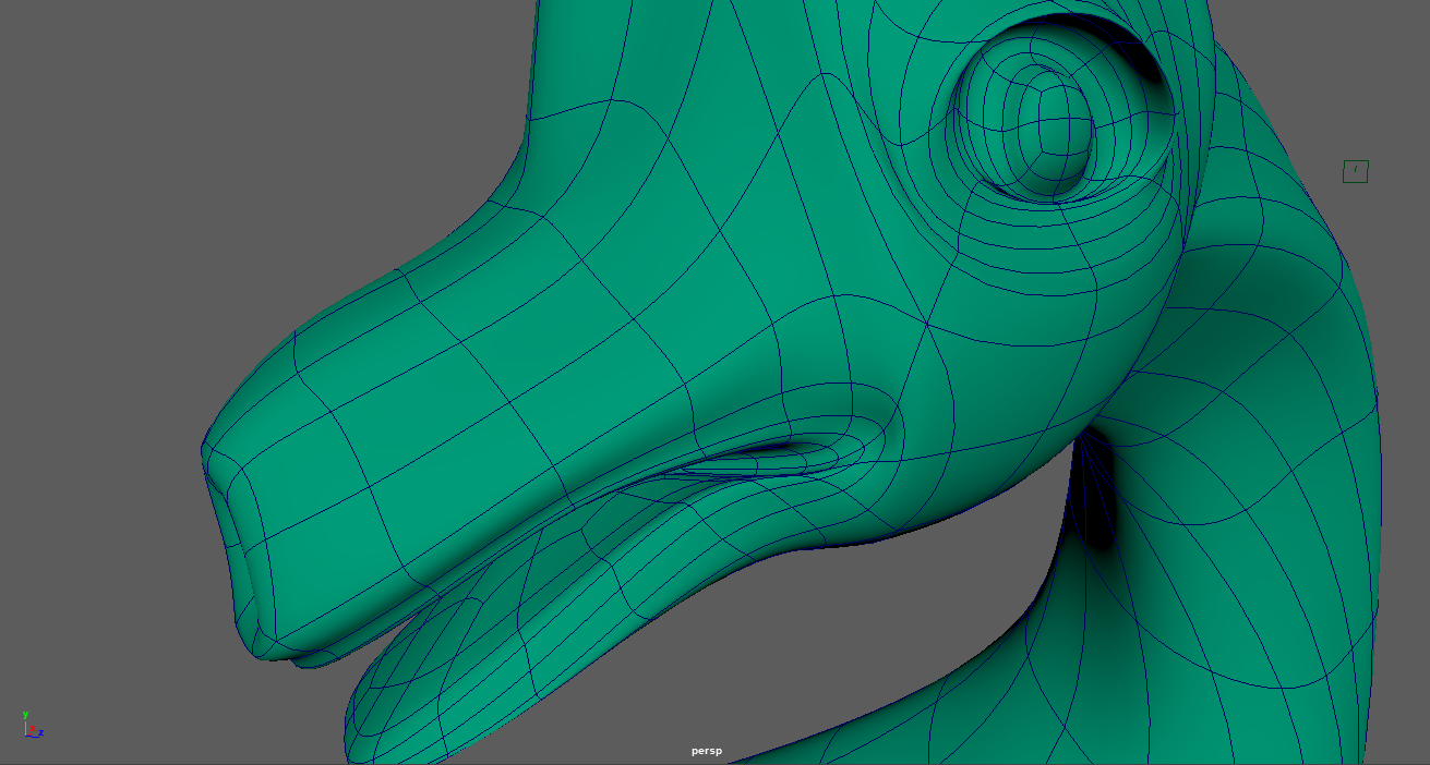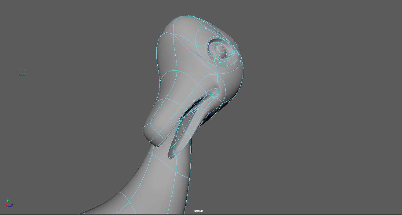 To create the mouth, I extruded a couple of times to create a "border" section that would become the lips. The interior faces of the mouth were then deleted and the hole was filled by using Targeted Weld to bring all the vertices around the hole to a single point. This seemed to accurately reflect the mouth of the toy pretty well, and allowed me to add more edge loops when I decided to refine the look of this area further. I'm happy with how this part ended up.