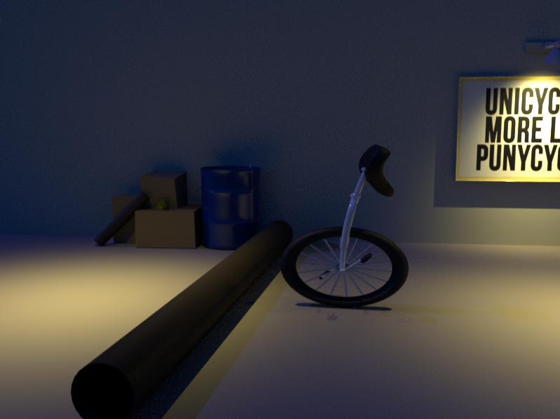 Thumbnail: Rigging: I added a Bend Deformer to the SeatAndBars portion of the model, so that I could easily keyframe any bending the upright section needed to do. An Aim Constraint was used on the seat to provide a point of focus for the "head". The wheel was given a control curve. The full model was given two control curves-- one for translation and Y-rotation, and one for Z-rotation only. I also created a single control curve that controlled the attributes for Squash/Stretch and Bend. I relied on expressions for a few control links, but in some cases I could have used set-driven keys instead. For example, instead of using a single driver to control both a squash and stretch key, I used an expression to make that attribute proportional to stretch and inversely proportional to the squash. The biggest time saver was the expression that controls the wheel rotation as a function of the value of the model's position along its motion path constraint. Animation: As mentioned previously, the model squashes and stretches as it leaps over an obstacle, and follows an arc as it does so. The upright section bends to variously provide a bit of followthrough or anticipation. As the unicycle rolls or leaps, the pedals are moving, and the seat seems to look around to provide interesting secondary action.