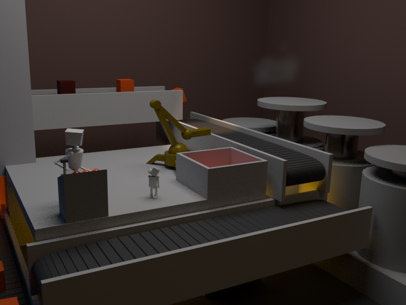 Project 4 December 12, 2019 Project 4: Choose your own adventure: In this project, I was tasked with pursuing an as of yet unexplored area relevant to the class or explore more deeply one of the topics we had covered in class. Naturally, I bit off more than I could chew, but ultimately learned a lot about what not to do in Maya. My expressed goal was to animate two humanoid models within a humorous vignette in the style of a Buster Keaton or Charlie Chaplin film. I began by modeling and rigging my own "blockman" robotic characters, one apparently adult and one a small child. In this part of the task, I was successful. The characters are simple but capable and relatively easy to pose. One goal that I struggled with for a long time was the use of physics simulation to help create some interactivity for the characters. Getting the simulated objects to behave in a predictable fashion absorbed too many hours of my time in the long run and ultimately I had to abandon the use of this idea. Even getting a simple cube to collide and then move with a rotating conveyor belt proved beyond my ability. I tried using each of the simulation plugins I could get my hands on, but still I failed in this task. Ultimately, the only bit of simulation that ended up making it into the final product is a few puffs of Bifrost Aero-generated smoke. Because I was doing so poorly at simulating, I decided to at least make the project look as nice as possible. I had modeled and rigged my own characters and complex, animated environment for them to play in. I chose to use Arnold as the renderer and used a lot of lighting to add more atmosphere to the scene. I really enjoyed how clean the non-textured shaders look, almost like the facility is mostly made of plastic toy material.